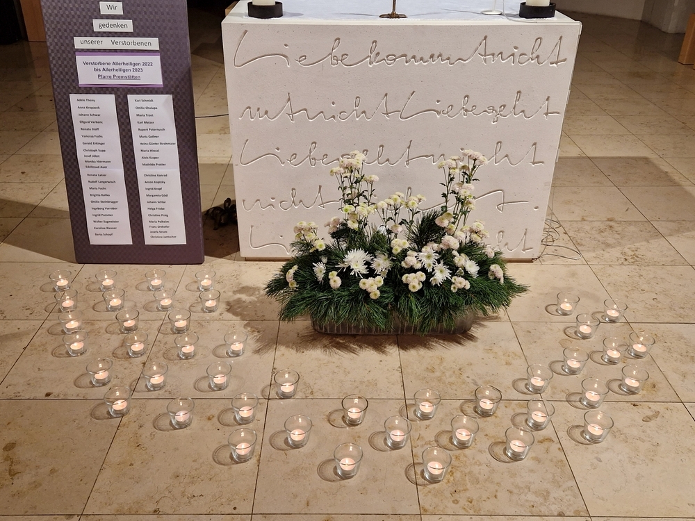 Noch einmal wurden – wie schon am Friedhof – die Namen der Verstorbenen von Allerheiligen 2022 bis Allerheiligen 2023 vorgelesen. 43 Teelichter wurden entzündet, eines davon für alle nicht namentlich genannten Verstorbenen.